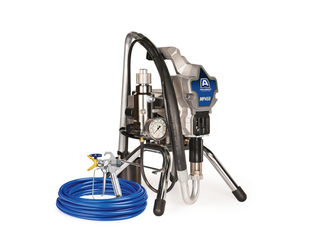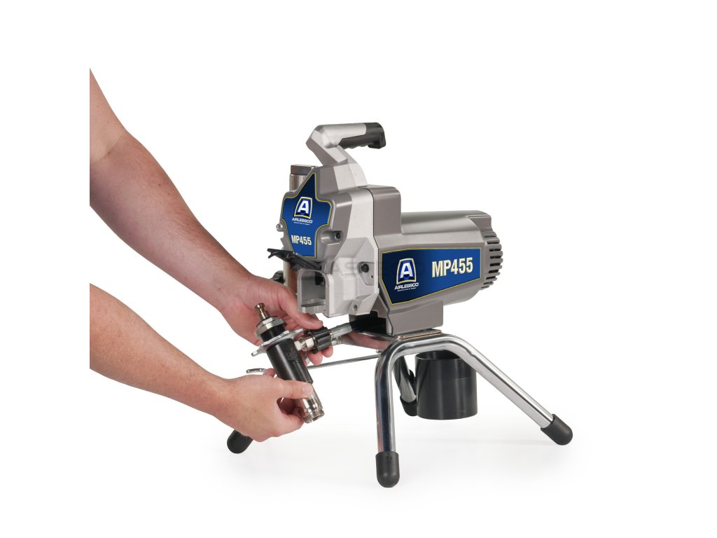Stříkací zařízení MP455 je vybaveno novým čerpadlem Pro-Duty, které umožňuje rychlou výměnu a je opatřeno těsněním s možností nastavování zvenčí, aby jste mohli pokračovat ve stříkání. Stejnosměrný DC motor chlazený ventilátorem zajišťuje spolehlivý výkon každý den.